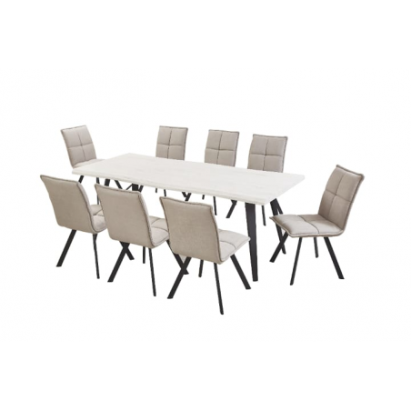 Chaise rembourrée en lin antitache, avec pieds en métal noir.