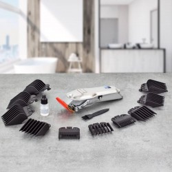 Notre tondeuse pour cheveux et barbe possède une lame en acier inoxydable d'une largeur de 46mm, de dents de coupe fines avec placage de titane ainsi que 10 sabots (1.5/3/4.5/6/10/13/16/19/22/25mm), vous permettant de vous tondre votre barbe et vos cheveux qu'ils soient secs ou humides avec une précision extrême et à la taille qui vous convient.